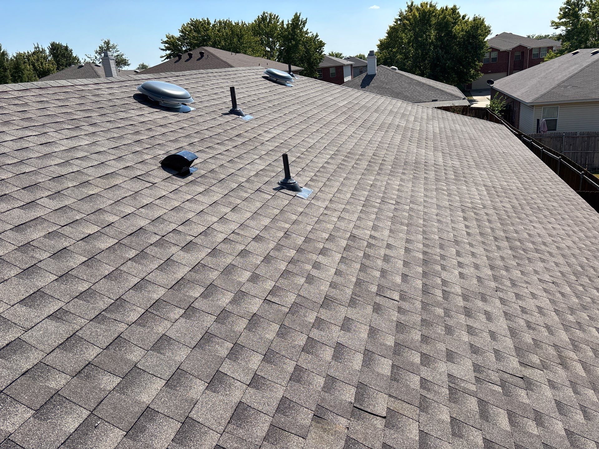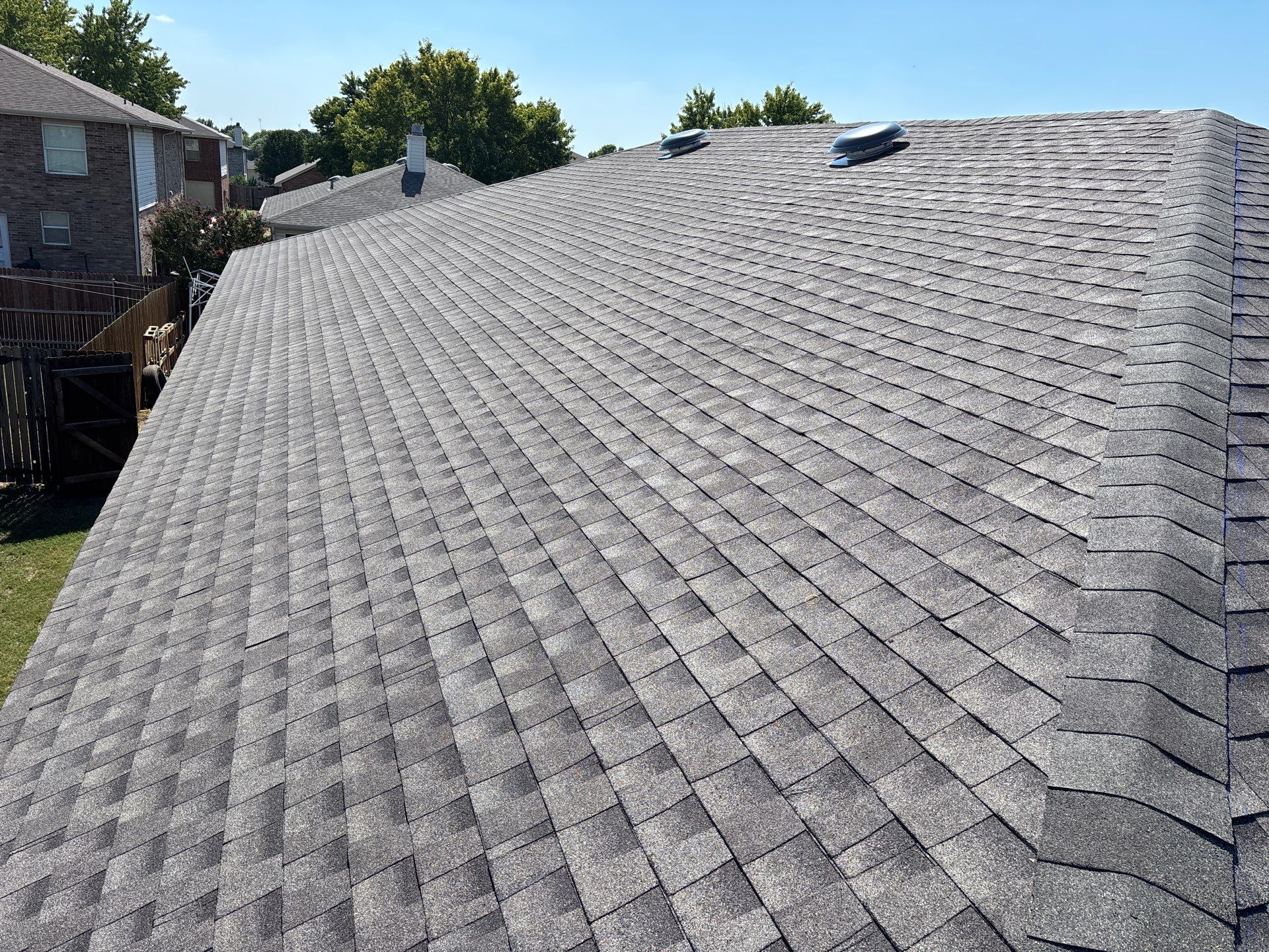 Full Roof and Partial Gutter Replacement using GAF Timberline in Weathered Wood. Gutter Color: Herringbone